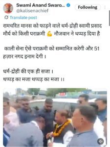 “भगवान राम ने अपने सेवक हनुमान को भेजकर उस व्यक्ति को थप्पड़ लगवाया जिसने बार-बार रामचरितमानस जैसे पवित्र ग्रंथों का अपमान किया। यह सनातन धर्म की रक्षा के लिए ईश्वरीय न्याय है।”