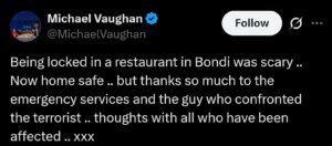 माइकल वॉन ने सोशल मीडिया पर अपने अनुभव साझा करते हुए लिखा कि एक रेस्तरां में खुद को बंद करना बेहद डरावना था। उन्होंने कहा कि अब वे सुरक्षित घर पहुंच चुके हैं और आपातकालीन सेवाओं के साथ उस बहादुर व्यक्ति का आभार जताया, जिसने हमलावर का सामना किया। वॉन की ये प्रतिक्रिया उस खौफनाक स्थिति की तस्वीर पेश करती है, जिसमें आम नागरिक और पर्यटक फंस गए थे।